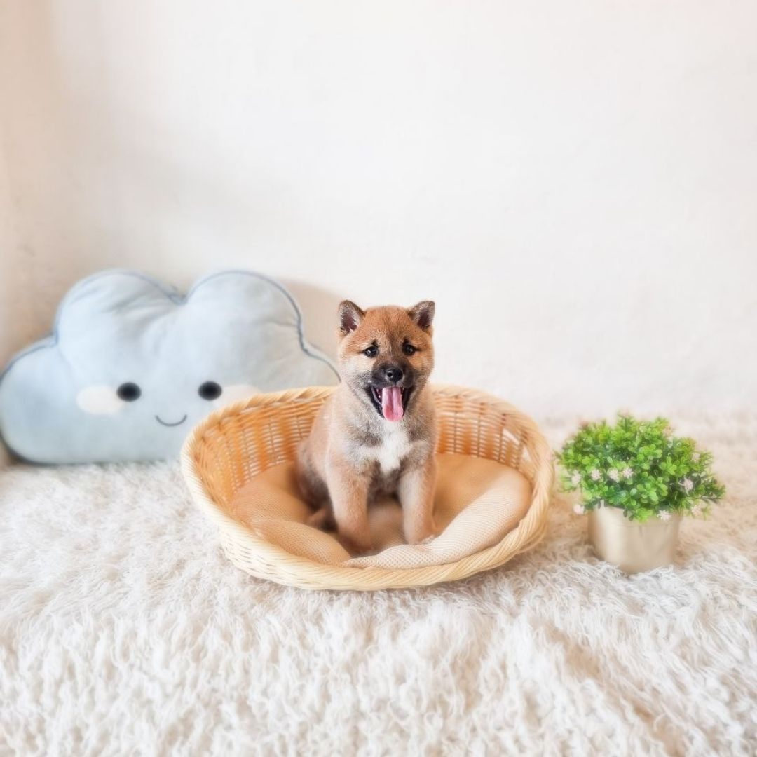 Chiyo’s sesame coat glows like brushed gold under the light, rich and soft to the touch. Her confident little smile hints at a heart full of spirit and sweetness.